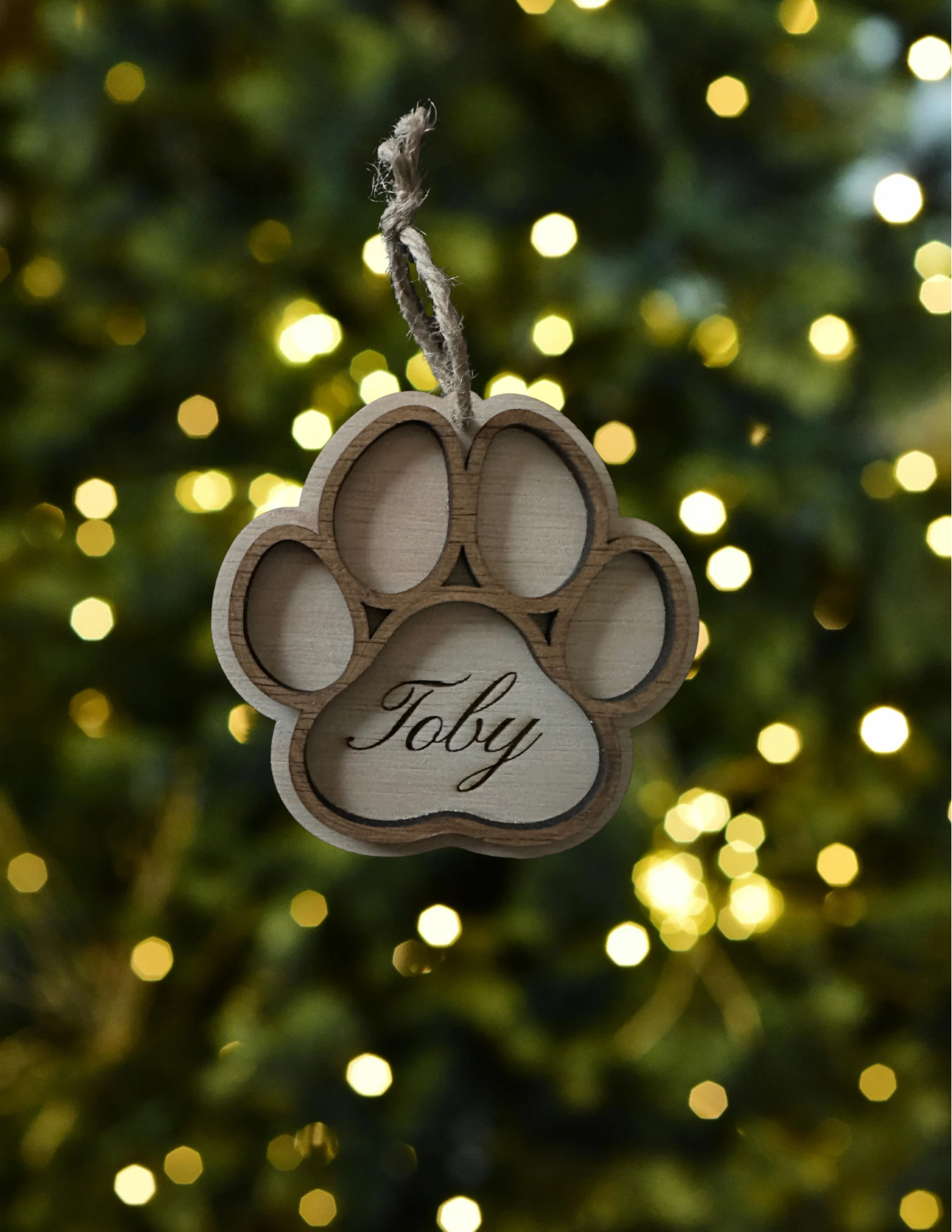 Engraved paw print Christmas tree ornament with personalized baby name.