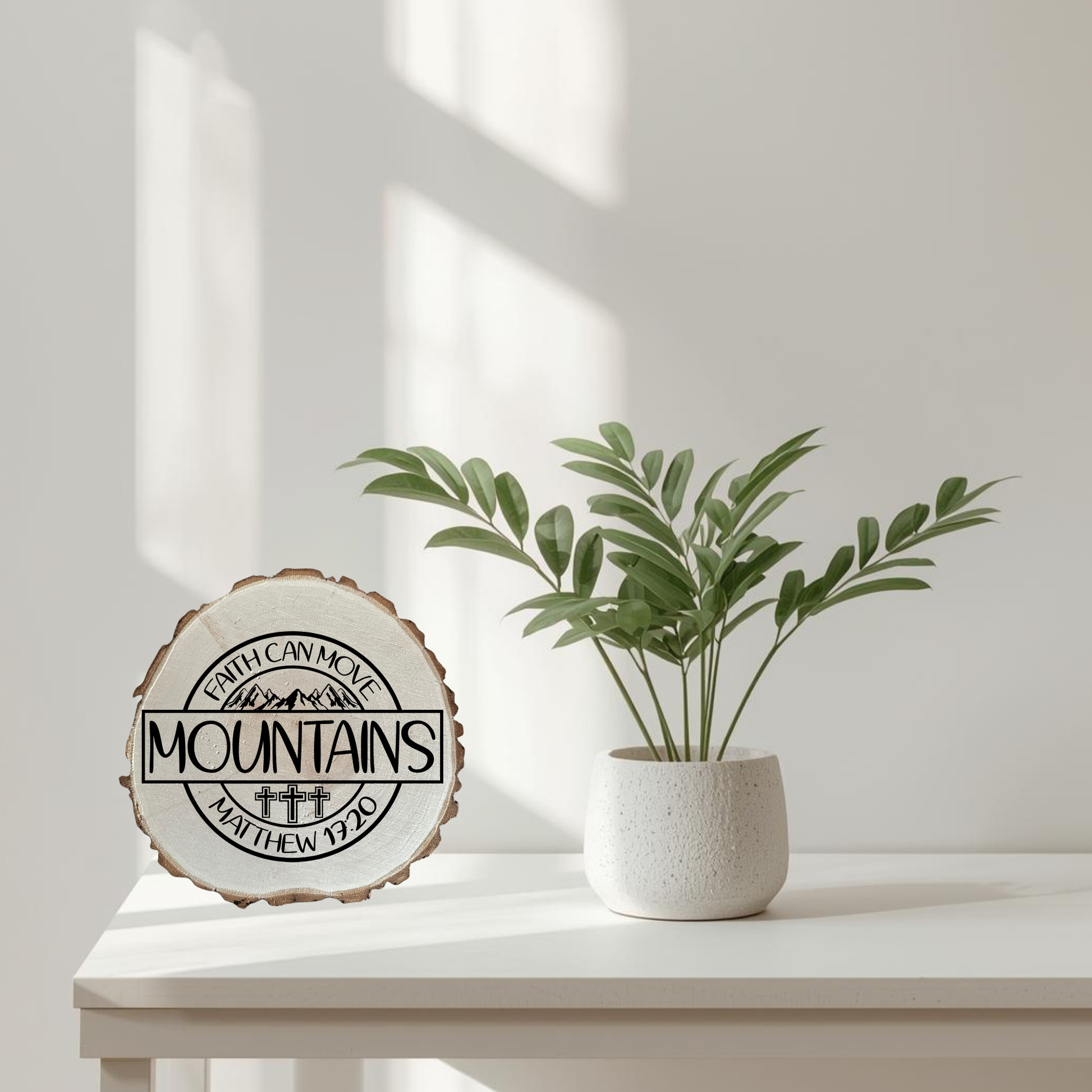 Bring faith and natural beauty into your space with this rustic engraved wood round, thoughtfully designed to inspire and uplift. Crafted from natural wood, each round features unique grain patterns and organic markings, making every piece truly one of a kind. The timeless engraving of Matthew 17:20 serves as a powerful reminder that even the smallest amount of faith can move mountains.